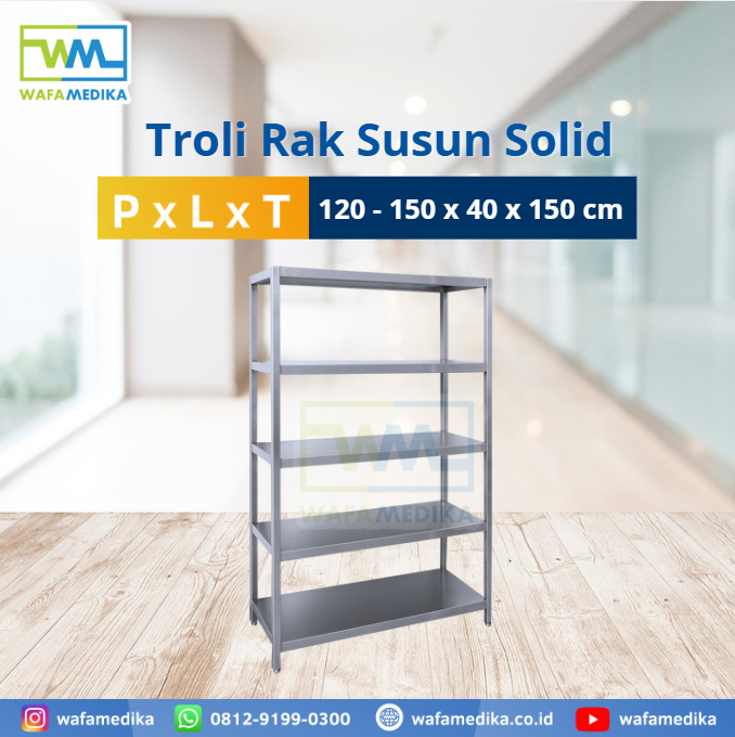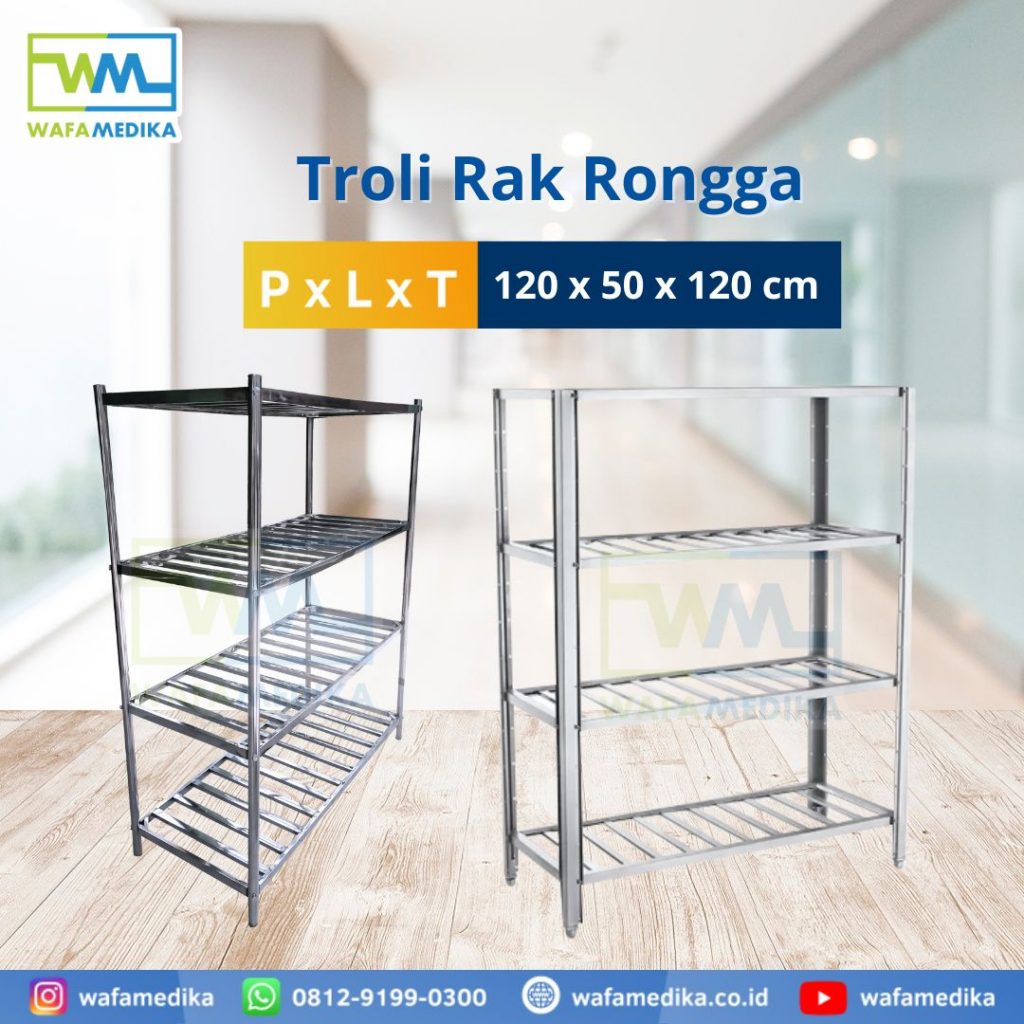 Wafa medika bisa custom ukuran, model untuk troli rak susun stainless, kami menggunakan material stainless yang berkualitas sehingga kokoh dan dapatdigunakan dalam jangka panjang